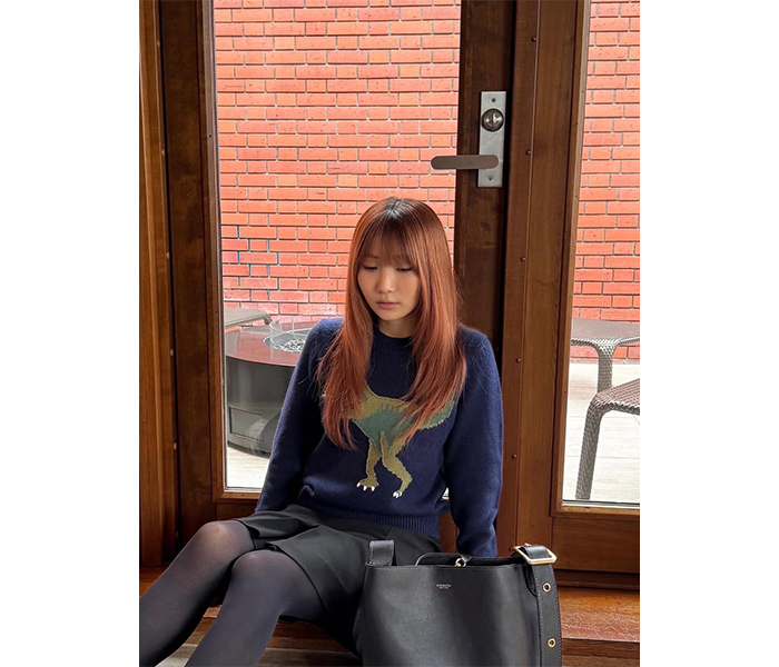 幾田りらは紺色のニットにミニ丈スカート、黒タイツを合わせたコーデで