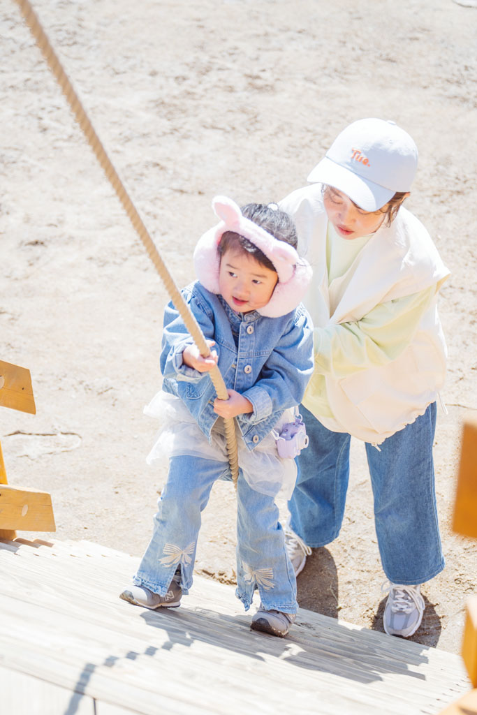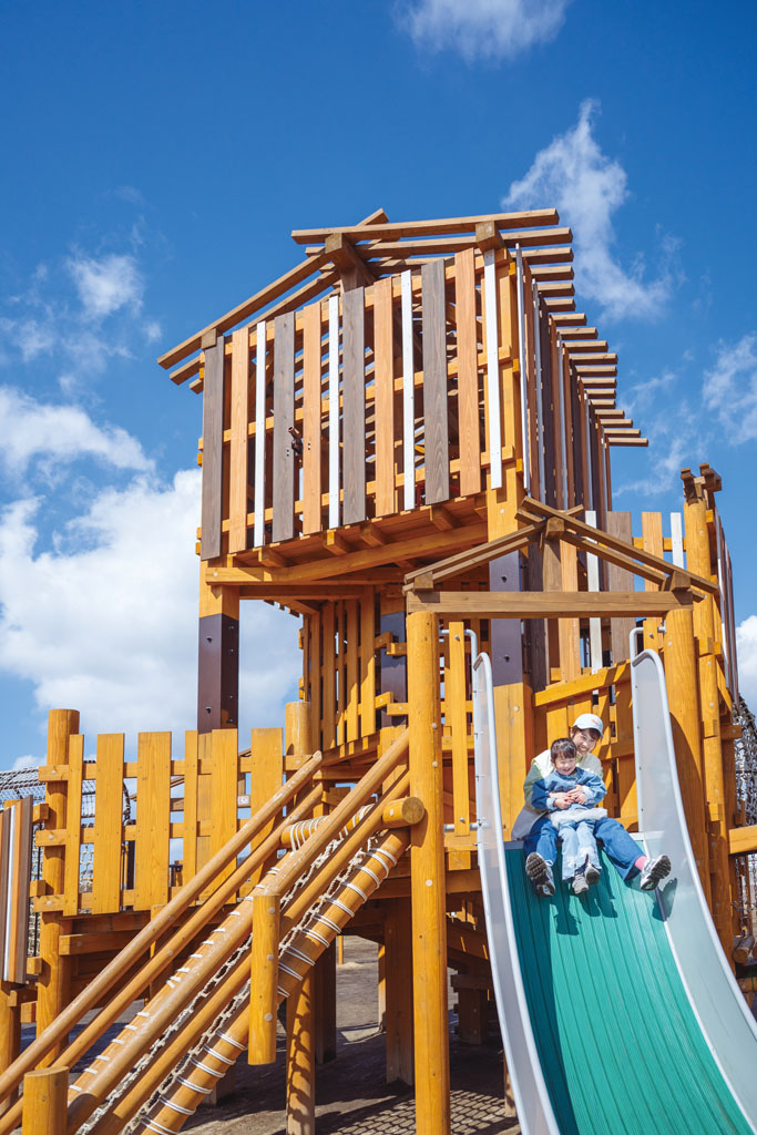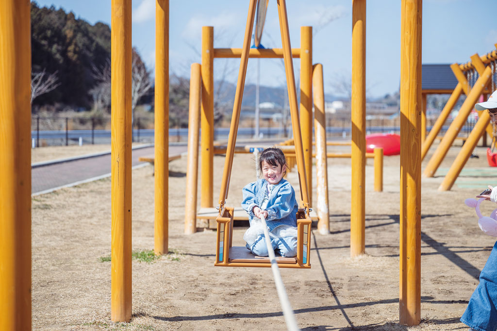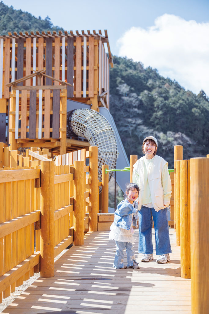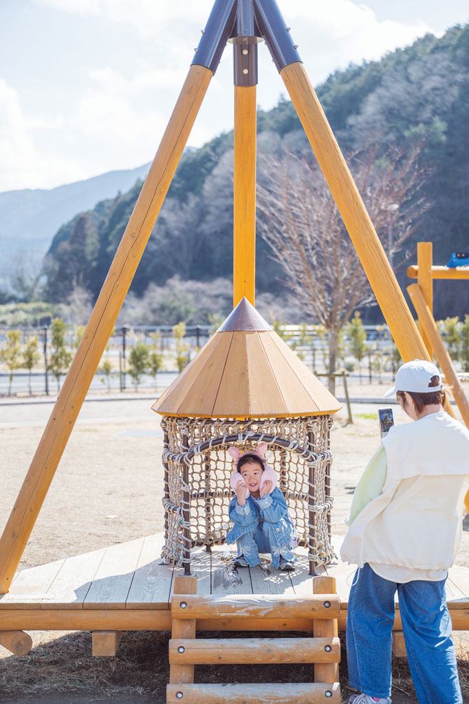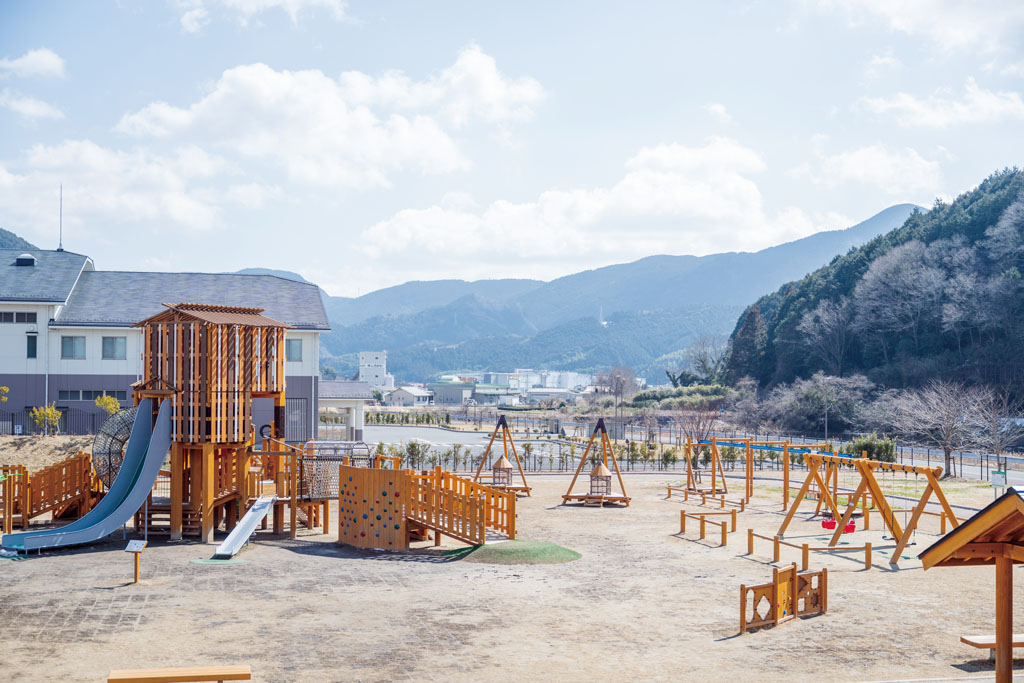 西予市産材を利用した木製複合遊具のほか、ターザンロープやゴンドラなど、ユニバーサルデザインにも配慮した多彩な遊具がそろう。高さ3mの築山に設置されたブランコでは、空を飛んでいるような感覚を味わえ、SNS映えする写真スポットとしても人気。