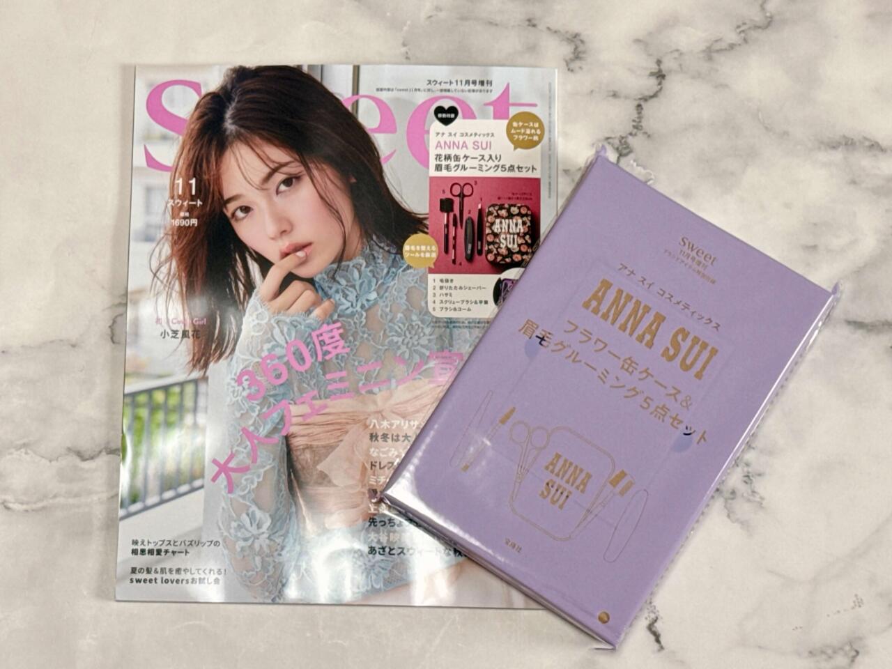 2025年10月10日(金)発売の雑誌『sweet(スウィート)』11月号増刊には、ANNA SUI (アナ スイ コスメティックス)の「花柄缶ケース入り眉毛グルーミング5点セット」が付録として付いてきます。