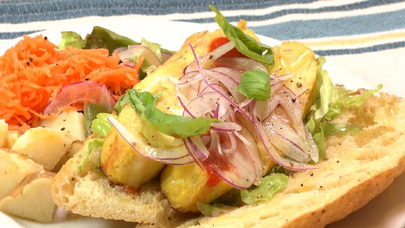テーブルに運ばれてきたのは、焼きナスとミートソースをたっぷり挟んだサンドイッチ。具材が見事なハーモニーを奏でています。