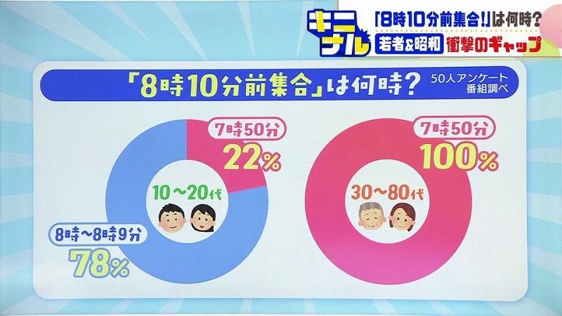 思わずスタッフが「昭和世代の人は、8時の10分前集合っていう読み方をしちゃう。だから7時50分に行きますっていう人が多い」と話すと、びっくり!