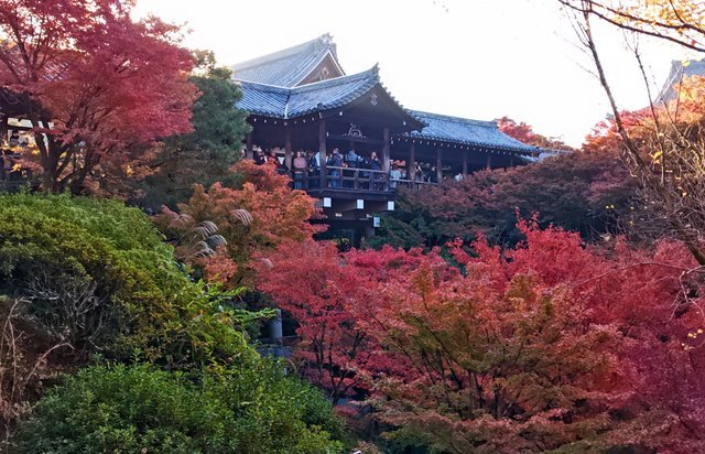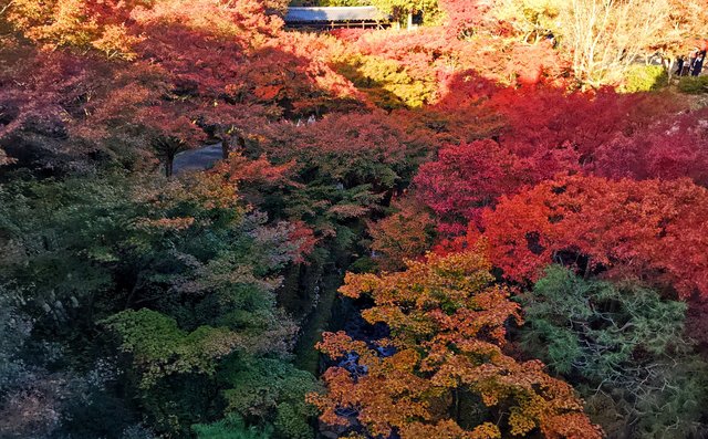 眼下の紅葉が最も美しくみられる通天橋の張り出し舞台部分は混雑していましたが、ベストスポットを独り占めする人などなく、順番に交代しながら写真撮影をしました。