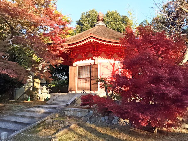 朱色のお堂と真っ赤な紅葉がとてもきれいでした。