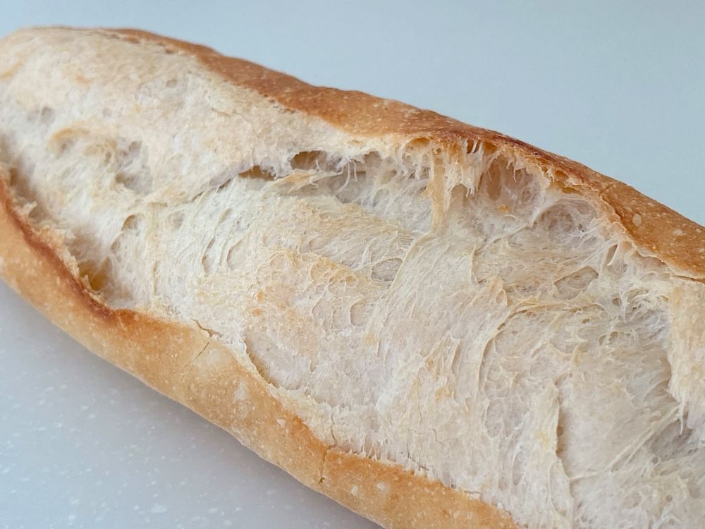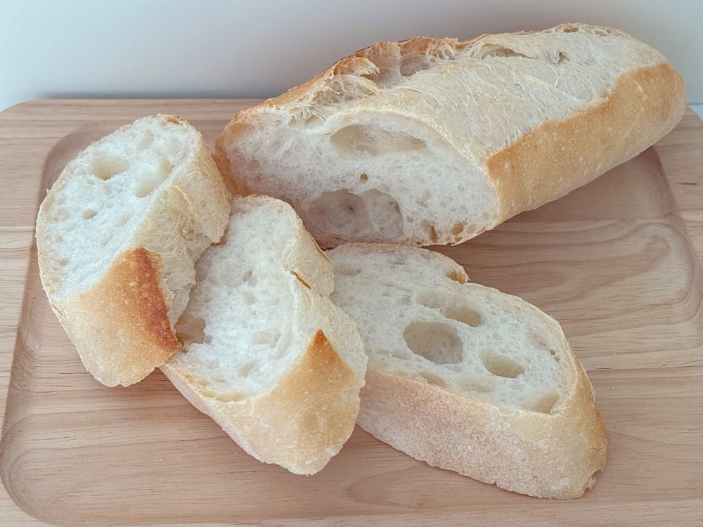 クラスト(外)はパリッと香ばしく、気泡がしっかり入ったクラム(中身)はもちもちとした弾力と噛むほどに小麦の香りが広がります。