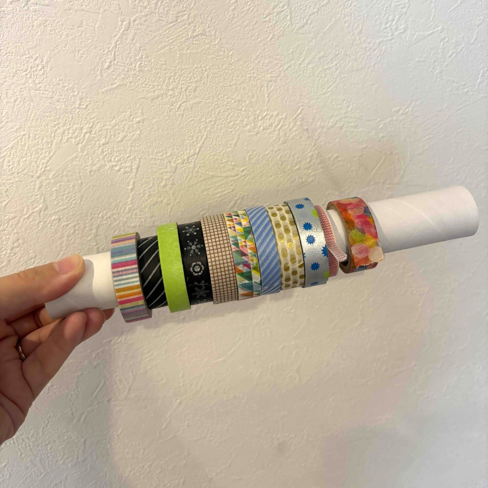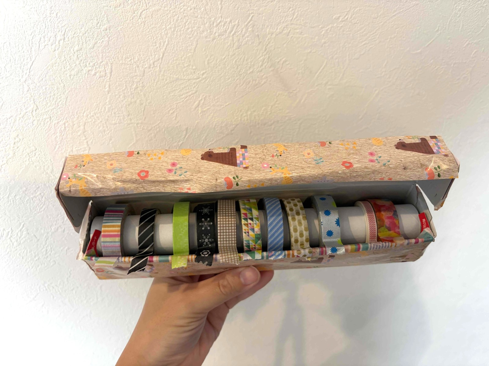 【3】ラップの芯にマスキングテープを通し、空き箱にセットしたら完成!
