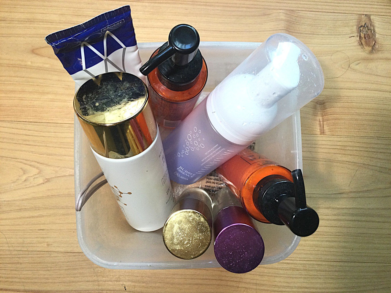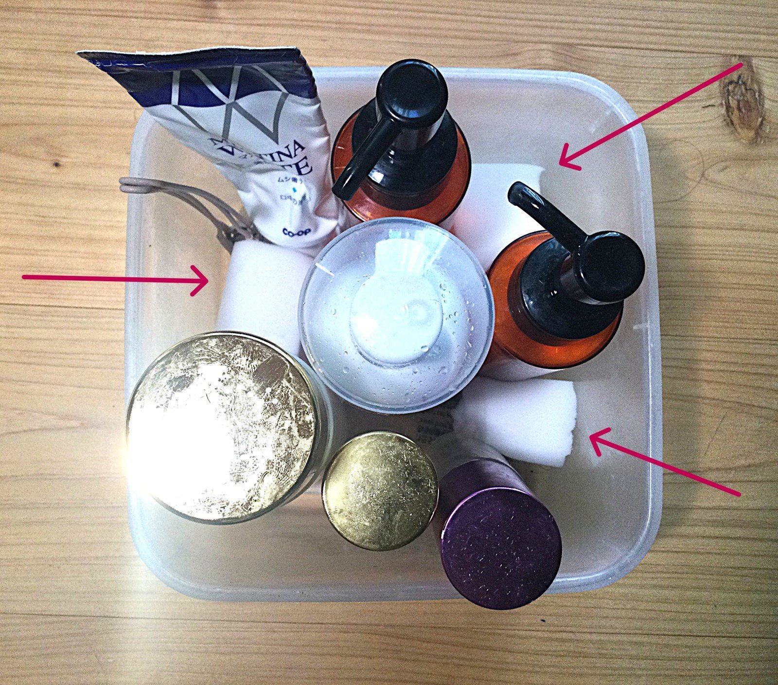 メラミンスポンジで仕切りを作ると、アイテムごとに安定して収まり、散らばりを防げるように。
