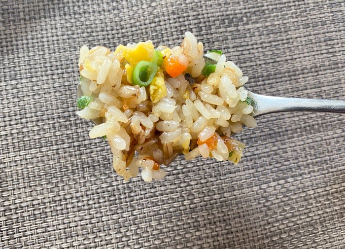 まずはニチレイから食べてみると、いつものというか食べ慣れている人も多いだろう優しい味である。時折タケノコが顔を出し、オーソドックスさが安心する。普通が一番ってやつだが、対するAmazonの炒飯は完全に別角度から攻めていた。