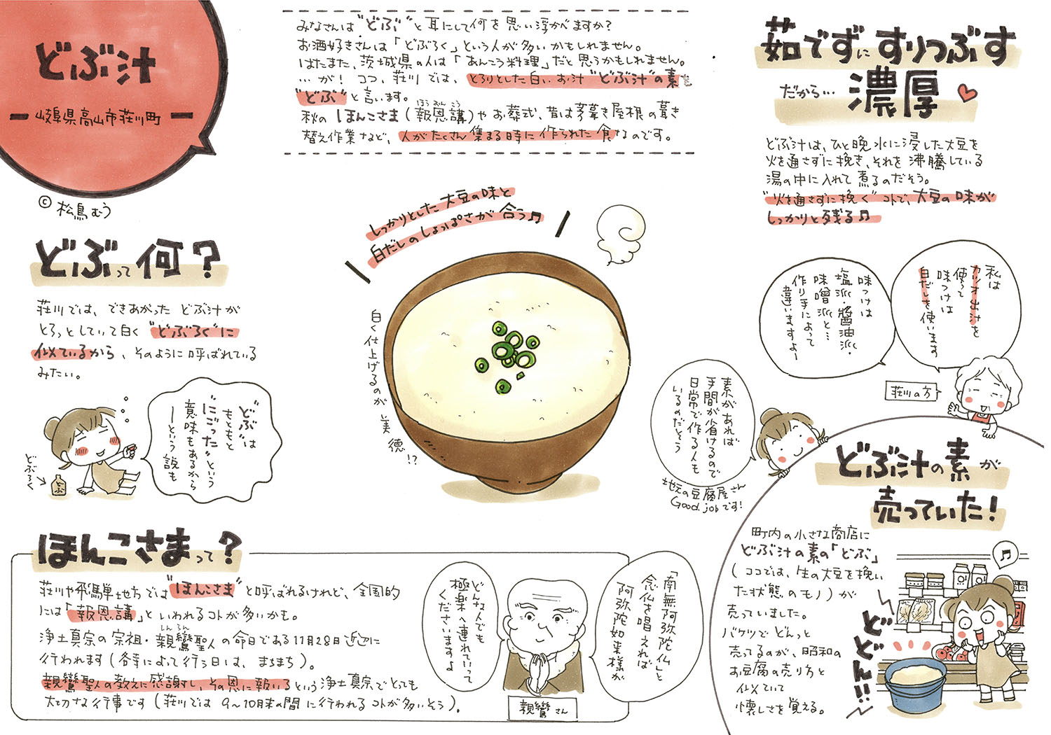 みなさんは“どぶ”と耳にして何を思い浮かべますか? お酒好きさんは「どぶろく」という人が多いかもしれません。はたまた、茨城県の人は「あんこう料理」だと思うかもしれません。……が! ここ岐阜県高山市の荘川では、とろりとした白いお汁「どぶ汁」の素を“どぶ”と呼びます。秋のほんこさま(報恩講)やお葬式、昔は茅葺き屋根の葺き替え作業など、人がたくさん集まる時に作られた食なのです。イラストを拡大して見てね~。