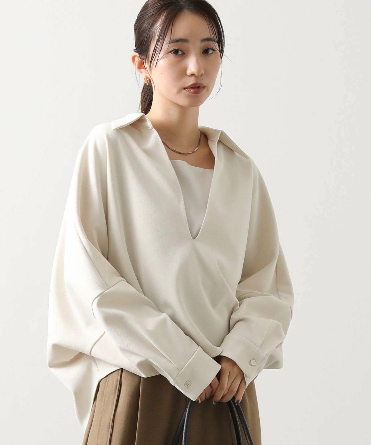 すっきり見えが叶う、深めスキッパー襟デザインのゆるトップス。
