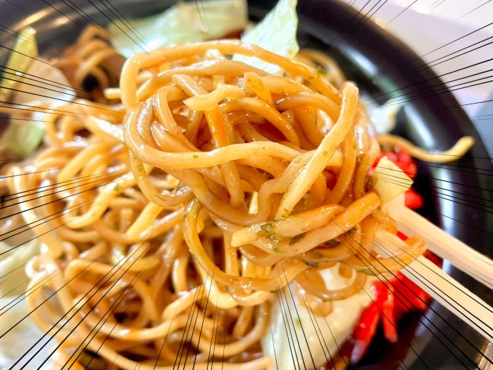 普通の焼きそばとは明らかに違う食感。グミを麺状にしたらこんなふうになるのかも。