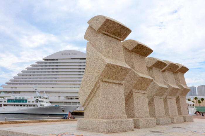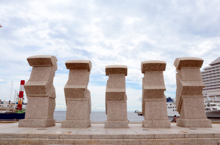石像があるのは「オリエンタルホテル神戸」近くの海沿い。確かにモアイ像のような形をした石像5体がまっすぐと立っています。