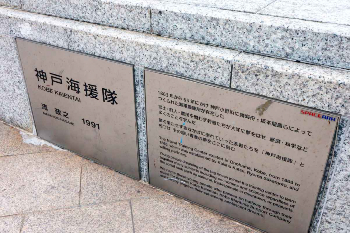 石像の下には「神戸海援隊」の文字が!神戸の小野浜には1863年から65年にかけ、勝海舟や坂本龍馬によってつくられた海軍操練所があったそう。このモニュメントはそこで学んだ若者たち(通称:神戸海援隊)をイメージして作られたものなのだとか。