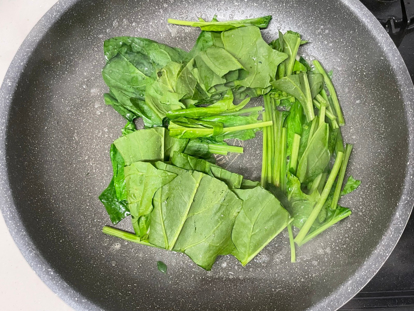 1.中火で熱したフライパンにバターを入れ、溶けたらほうれん草を加え、しんなりするまで炒めます。