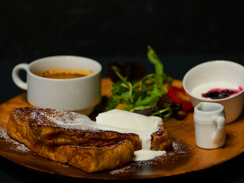 こんがり焼き上げる「フレンチトーストプレート」(1045円)は、外は香ばしく中はふんわり。生クリームやメープルシロップのやさしい甘さが朝にぴったりです。スープ、サラダ、ヨーグルトも付いており、バランスのとれたプレート。