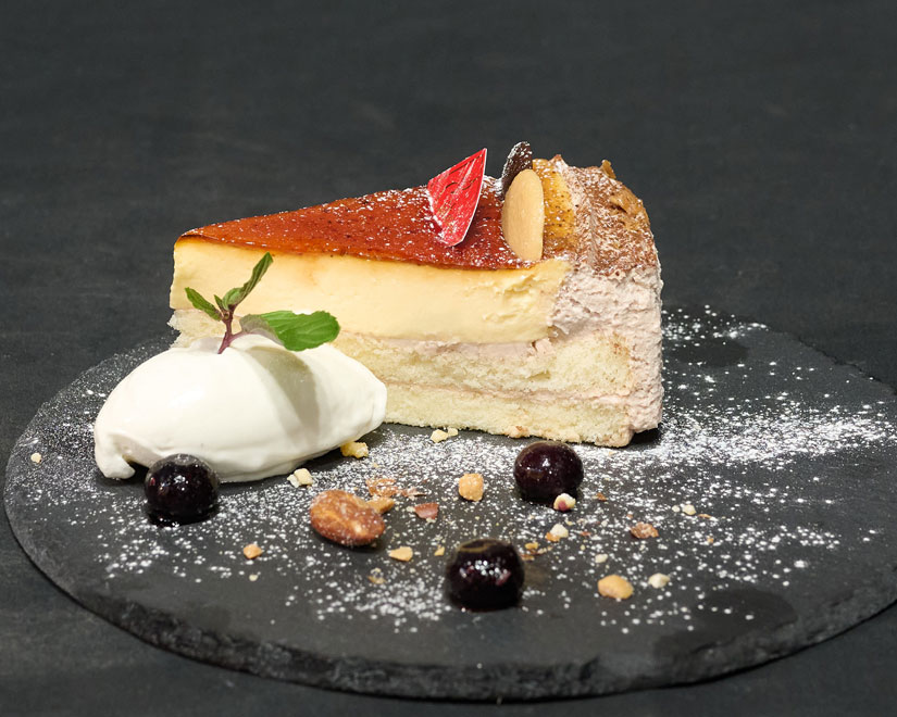 生クリームはクネル状に仕立てて盛り付け、仕上げに粉糖とチョコソースをひと筋。ミントやアイスクリーム、ベリーを添えた華やかな見た目も印象的で、ひと皿の中に「見て美味しい」「食べて幸せ」を感じられるデザートです。