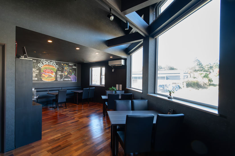 大きな窓からは浅間山の雄大な景色を望むことができ、自然光がやさしく差し込みます。壁面にはバーガーやスイーツを描いたチョークアートが飾られ、上品さの中に遊び心をプラス。ひとりでも、家族や友人とでもゆったり過ごせる居心地のよさが魅力です。