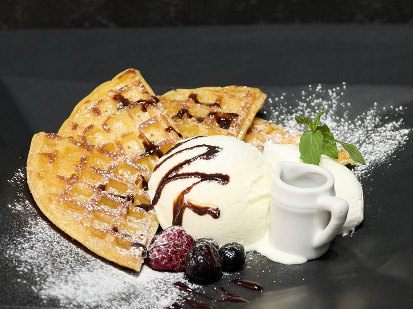 外はカリッと香ばしく、中はふんわりとした食感が楽しむ「ワッフル」(825円)もオーダーを受けてから焼き上げるスタイル。