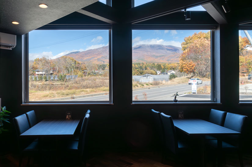 白を基調とした明るい外観と、黒を基調にまとめた落ち着きのある店内が印象的で、カフェのような心地よさとレストランの上質さが調和した空間が広がります。大きな窓の向こうには浅間山の稜線が広がり、時間帯によって変わる光と景色が、訪れる人に穏やかなひとときを届けてくれます。