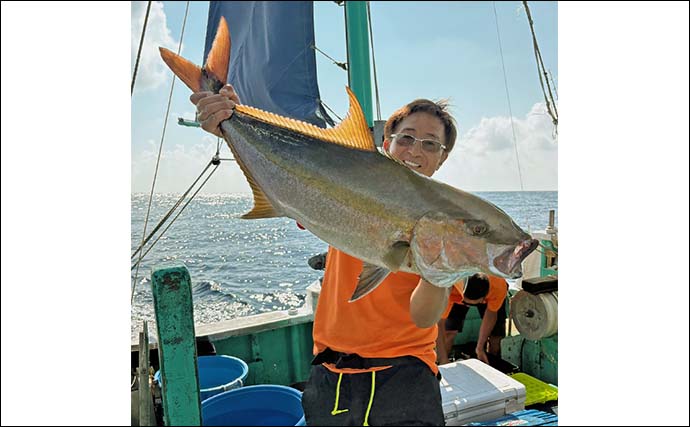 11時半を少し過ぎたころ、速かった潮が少し緩むと、状況にも変化が生まれる。右舷胴の間の桑幡和樹さんがアタリをとらえ、危なげないやりとりで5kg級カンパチをキャッチ。
