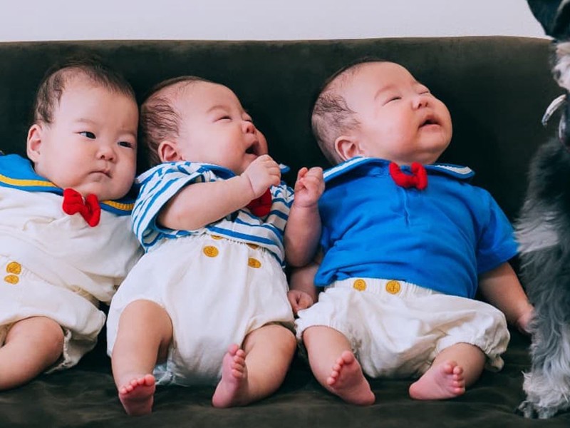 並んで座る三つ子ちゃんと一緒に愛犬シュナウザーさんも自宅での記念撮影に参加されたのだそう。