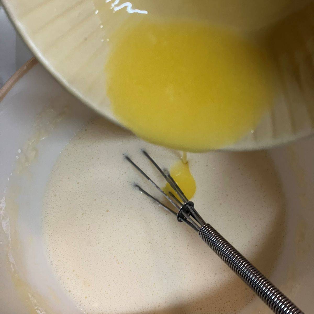 レンチンで溶かしたマーガリンも加え、さらに混ぜましょう。