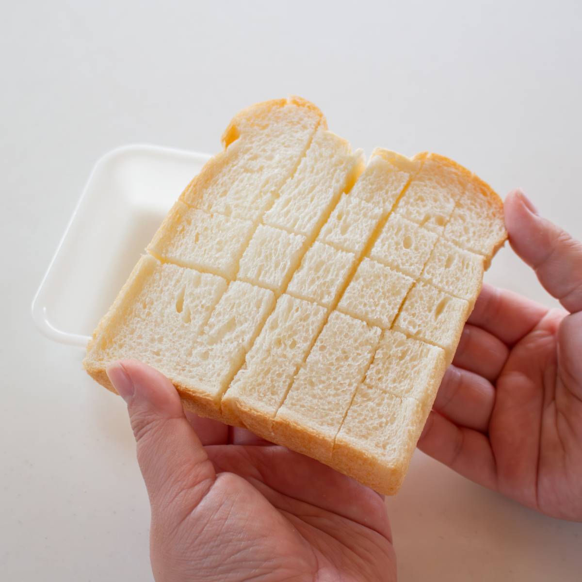 食パンの表面に、包丁で縦横に切れ目を入れます。
