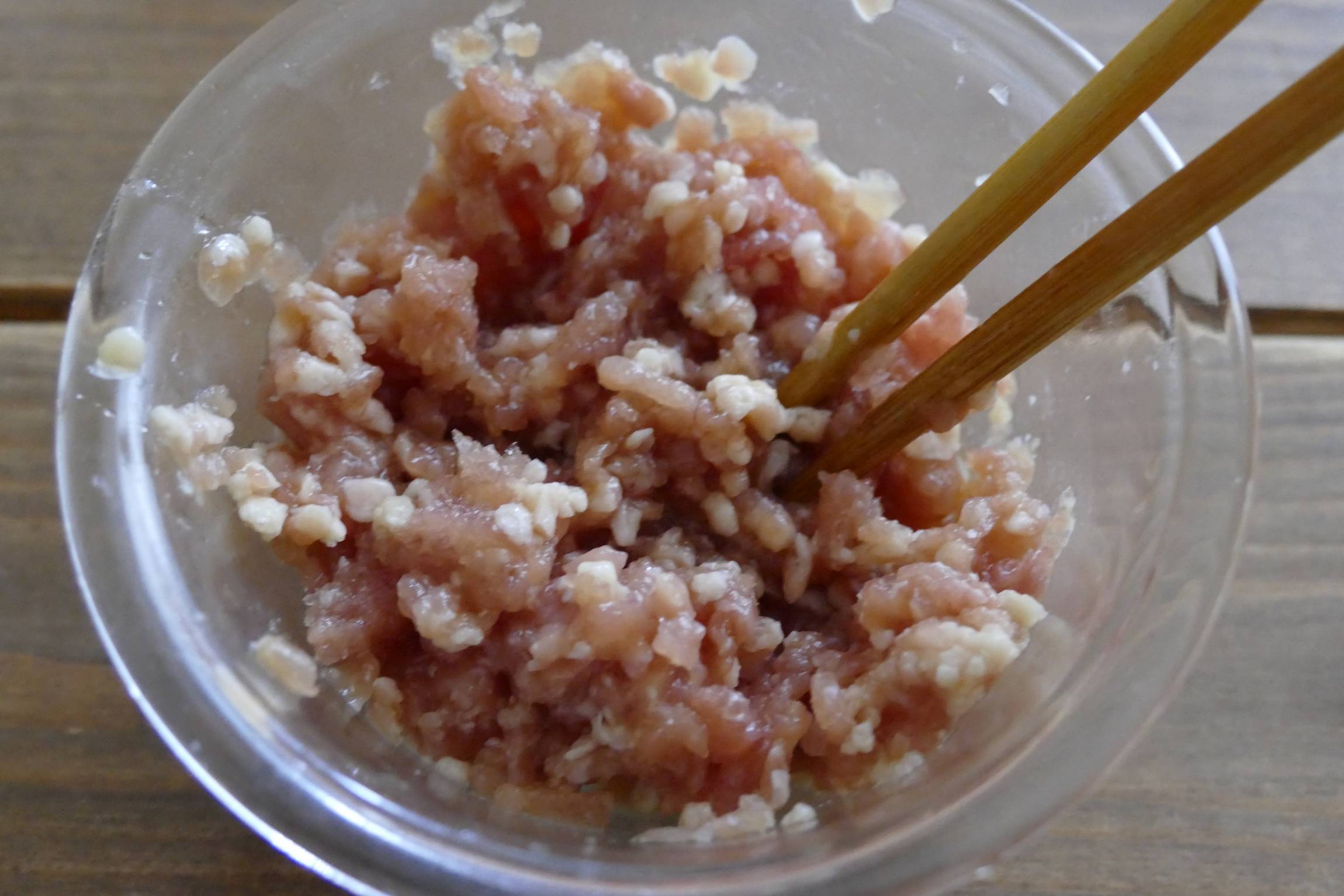 鶏ひき肉にしょうが(すりおろし)、しょうゆ、みりんを加えて箸で混ぜます。