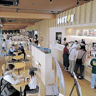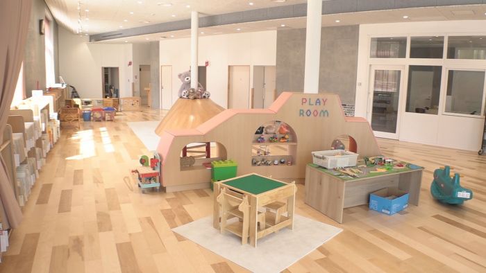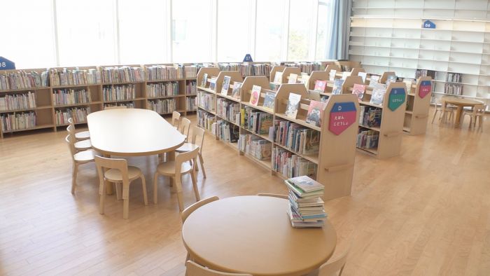 1階は「みんなの広場」で、雑誌などが読めるカフェやおもちゃ、絵本がある子育て広場、新聞コーナーなどがあり、大人から子どもまで気軽に立ち寄れる場所になっています。ガラス張りの多目的ルームもあり、イベントや講座などが開かれる予定です。