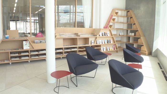 館内には、まちのランドマークとして多くの人に親しまれるよう、壁や本棚などいたるところに「山」をモチーフとしたデザインが取り入れられています。