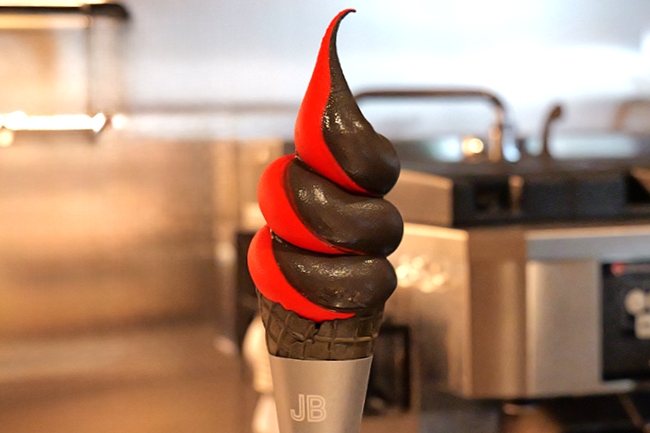 今回いただいたのは、お店の看板メニュー『JBソフトクリーム(ブラック×ストロベリーミックス)』(750円)。『伏見稲荷大社』をイメージした赤と黒の美しいコントラストに目を奪われます。