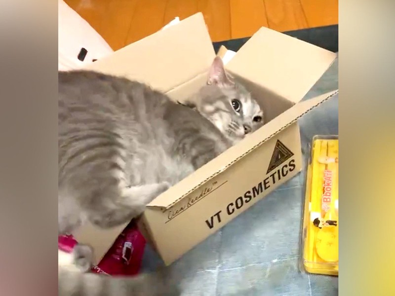 次はお尻が箱の中に収まりましたが、頭が出てしまい「ニャー!」と鳴きながらもぞもぞ。たまに上手く箱にはまることもあるそうですが、今回は箱を変形させて体をフィットできた状態で落ち着いたそうです。
