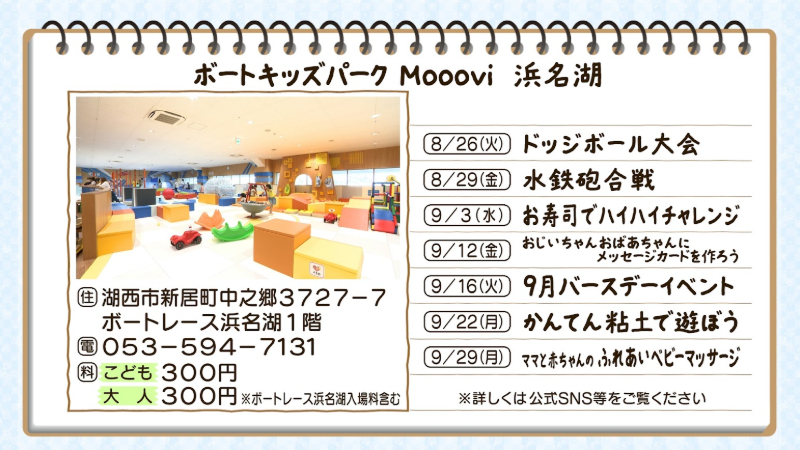 モーヴィ浜名湖では、毎月お楽しみイベントも実施中です。バースデーイベントや水鉄砲合戦など、詳細はホームページでご確認ください。