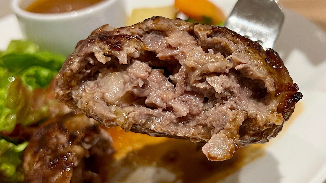 ひき肉に加え、塊肉を包丁でカットしたものも一緒に練り込んで焼き上げているんだとか。しっかり肉を食べている感覚が味わえて、噛めば噛むほど肉の味が広がります。