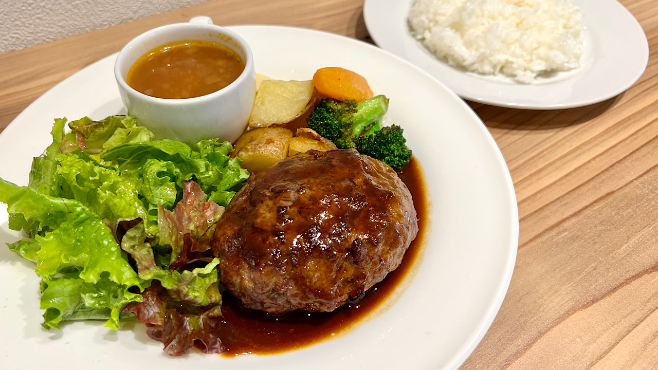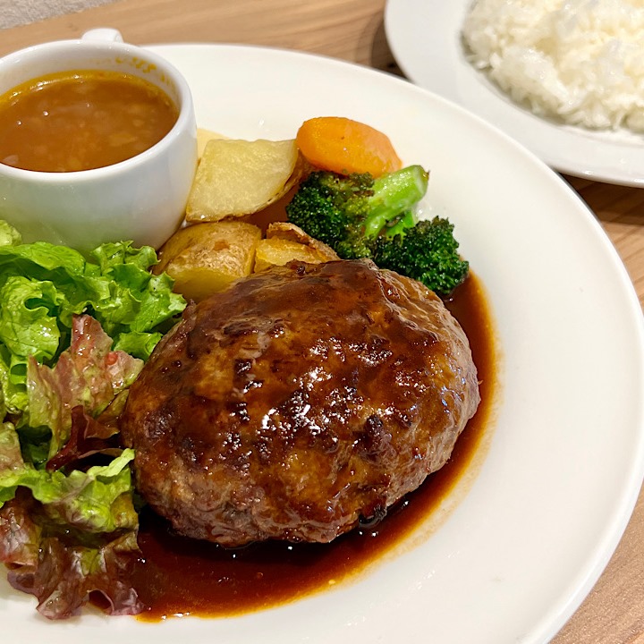 ふっくらと大きなハンバーグにグリル野菜とスープ、ライスがセット。