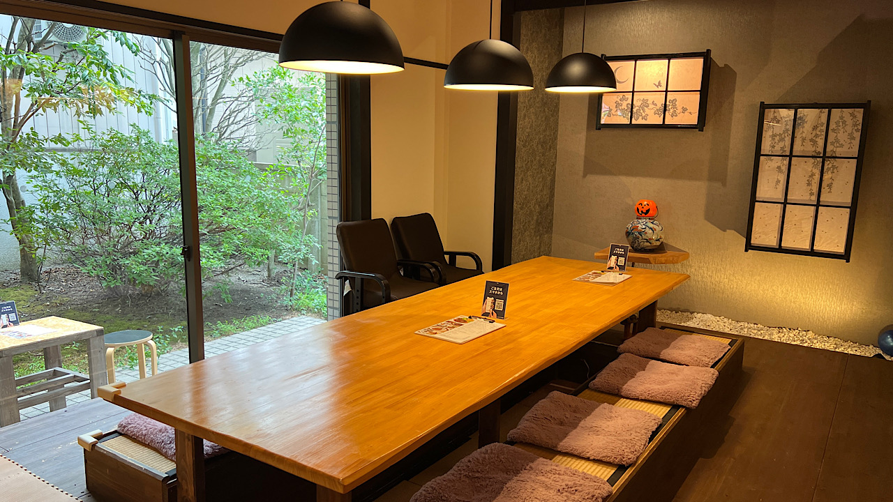 グループで利用できる小上がり席もあります。掘りごたつ式で足を伸ばせるので、あぐらや正座が苦手な人でも安心です。