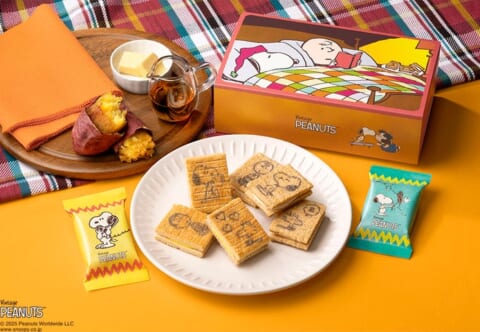 秋冬限定の新作として、『スヌーピー シュガーバターサンドの木 蜜いもメープルバター仕立て』が登場します。紅はるかがねっとり甘い蜜いも風ショコラとして、メープル香るバターたっぷりのシリアル生地でサンドされた一品です。個包装やお菓子にはスヌーピーたちがデザインされており、お菓子の絵柄は全5種類、個包装の絵柄は全4種類がランダムで封入されます。