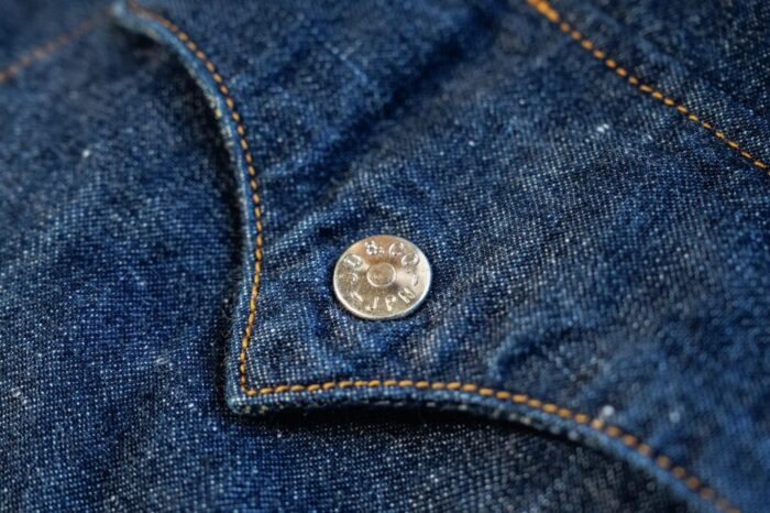 ポケットのフラップや前立て、カフスのスナップボタンはリベット型を採用。ブランドの刻印が入るオリジナルのボタン。