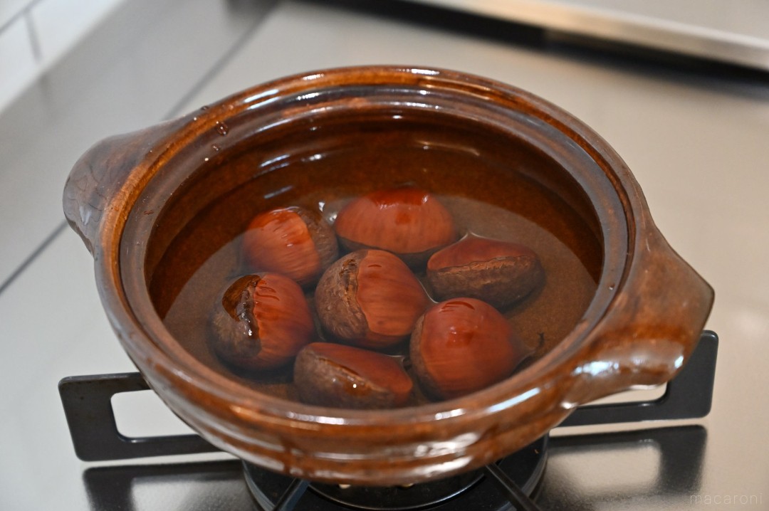 1. 鍋に冷凍した栗とお湯を入れ、弱火で10分ほど煮る