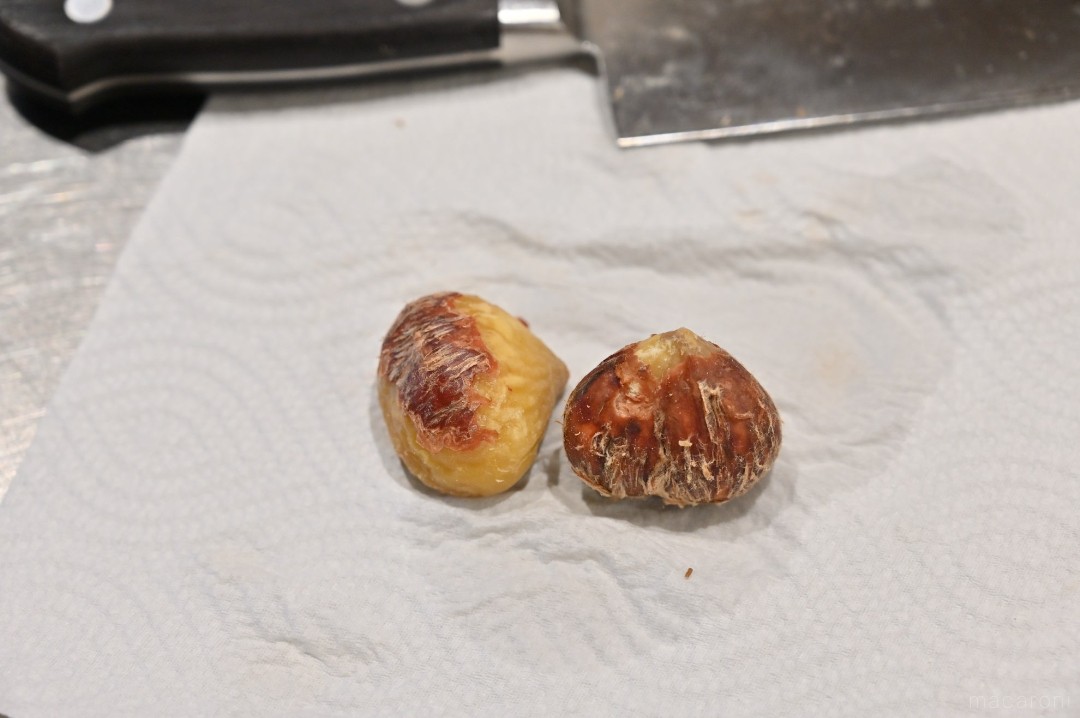 鍋で煮る方法だと、渋皮は包丁を使わなくても手で剥けるほどはがれやすくなっています。ブドウの皮のような感じで、するするときれいに剥けました。
