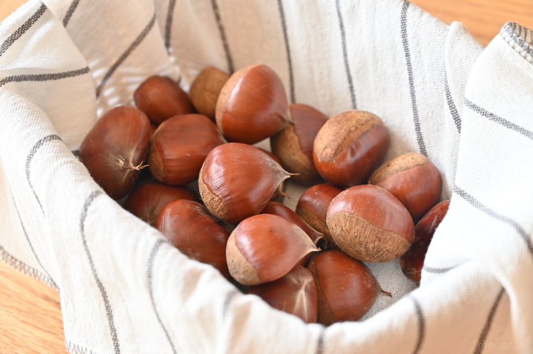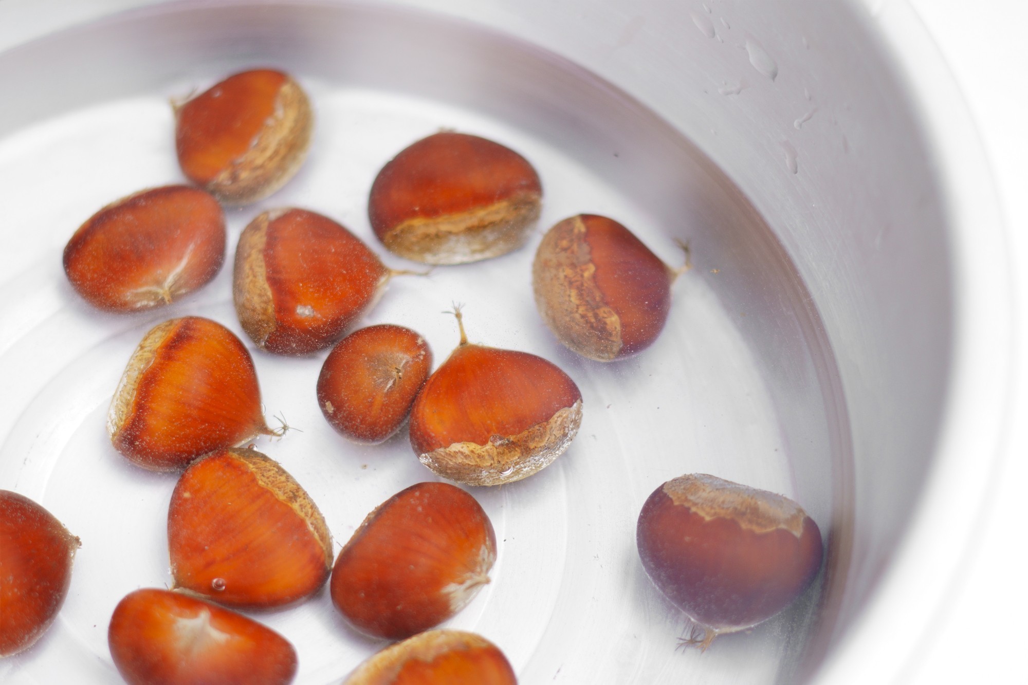 まず、よく洗った栗を熱湯に1時間浸けます。時間になったら栗をお湯からあげ、頭の部分にハサミで十字の切り込みを入れてください。これで栗の下準備は完了です。