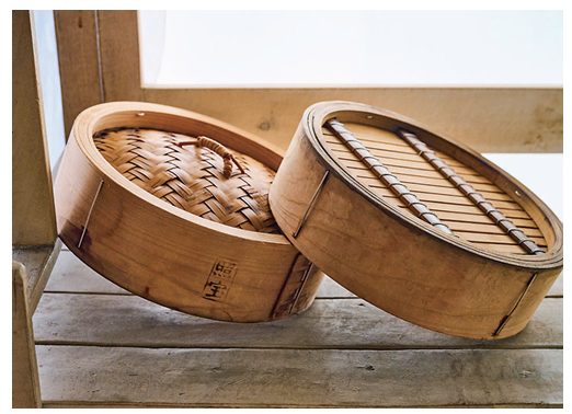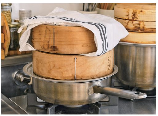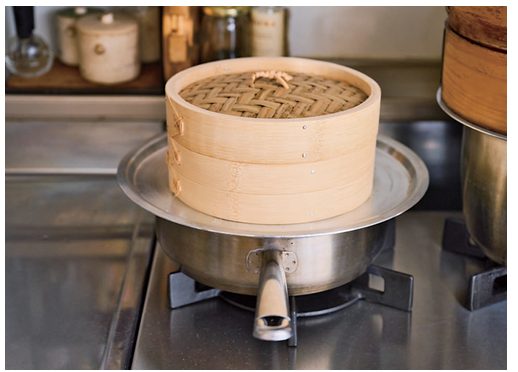 蒸すというのは、せいろ(蒸し器)の中でじっと動かさず、 でもふわふわしっとりした蒸気でゆっくり熱を入れるという方法。 上へ上へと湯気が上がり上昇するイメージ。