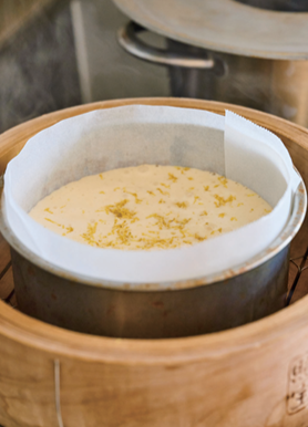 オーブンシートを敷いた型に流し入れて①をのせ、蒸気の上がったせいろで30分ほど強めの中火で蒸す。