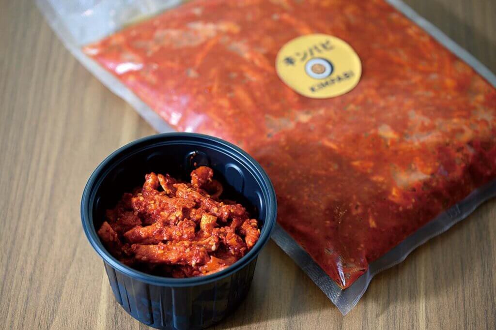 こだわりの自家製細切り大根キムチ(40g150円~)は、唐辛子の辛さを引き立てた本格的な味。