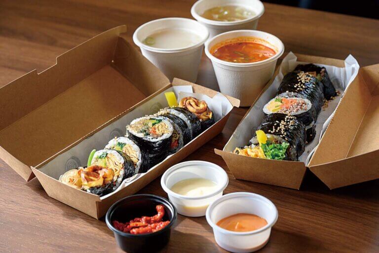 こちらのキンパは、ゴマ油で香り付けしたご飯に、下味をつけたナムルやお肉といった具材をたっぷりと巻き込んで仕上げています。多彩なメニューの中でも、7種類のキンパと3種類のスープから組み合わせを選べるセットメニューが特に人気。テイクアウト、イートインどちらでも出来たてを味わえます。