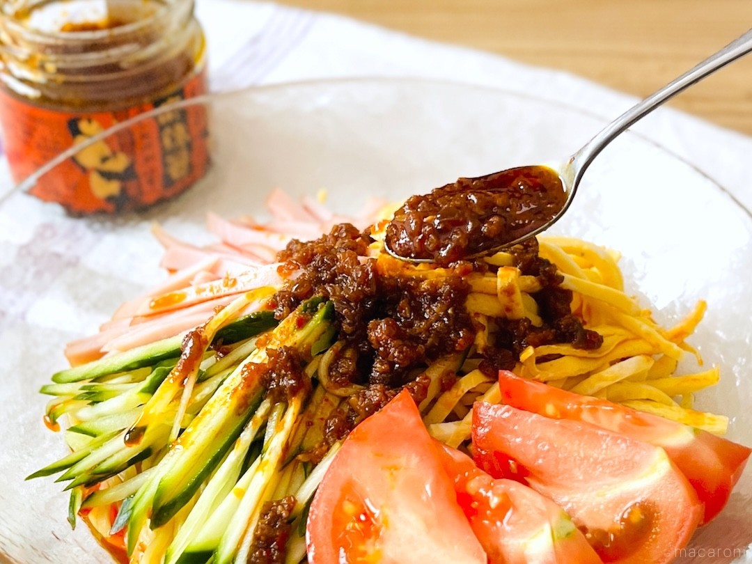 お好みの量の麻辣醤を冷やし中華の上にトッピングすればアレンジ完了です。
