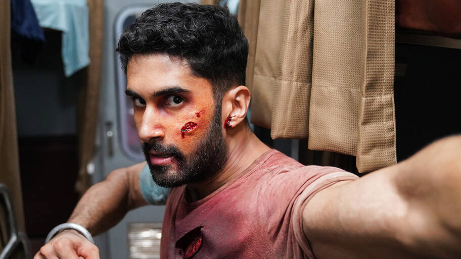 映像は、夜の寝台列車に武装強盗団が乗り込み、襲撃を開始する重要シーンだ。乗客から次々と金品を奪う強盗たちは、主人公アムリトにも襲い掛かる。まさか彼が最強の特殊部隊員とも知らずに…。アムリトと、同僚で親友のヴィレシュも刃物を向けられ、騒ぎを大きくしない為にも大人しく金品を渡すことに。