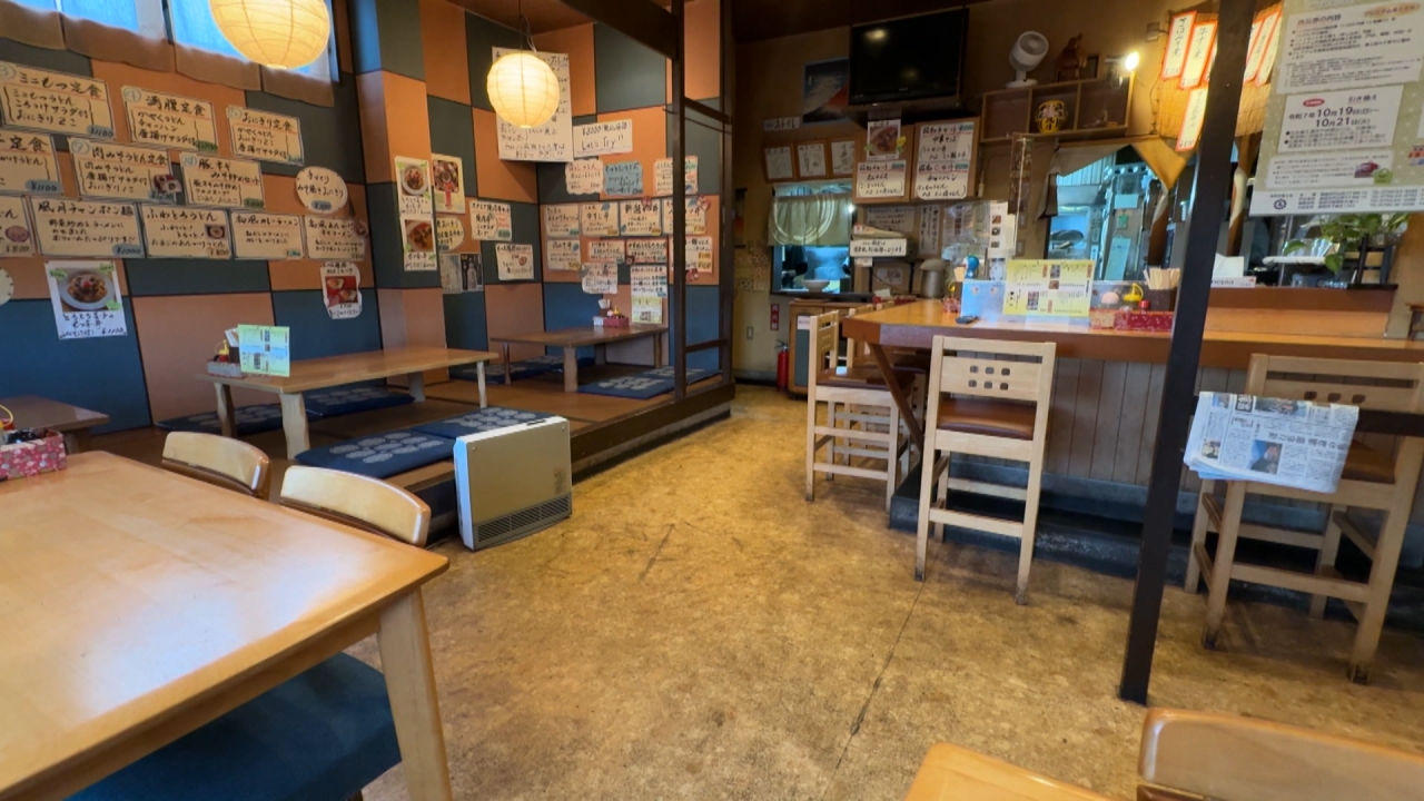壁にはたくさんの手書きメニューが貼られ、アットホームな空間です。