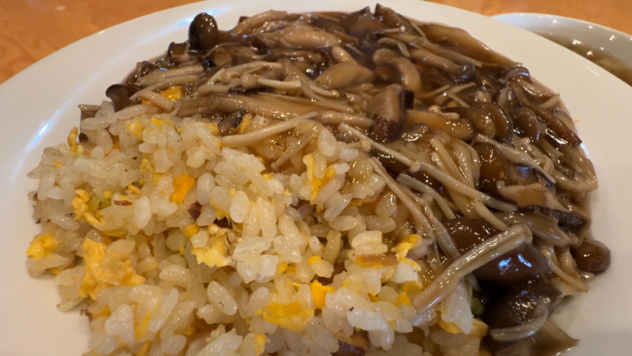 きのこたっぷりのあんが、チャーハンの上からとろ~り。オイスターソースをベースにきのこがだしを吸って、滋味深くコクのある味わいです。