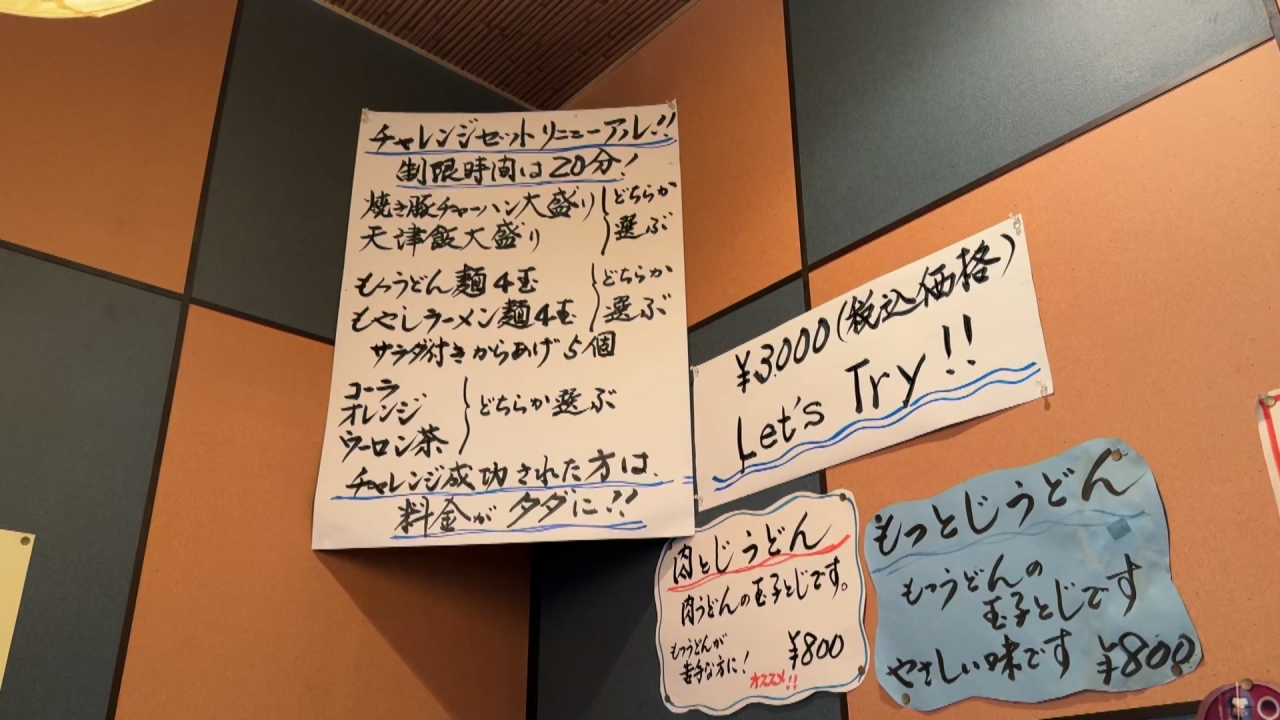 チャレンジセットは、ごはんものがチャーハンか天津飯のどちらか、麺はもつうどんかもやしラーメンか、どちらかを選ぶことができます。