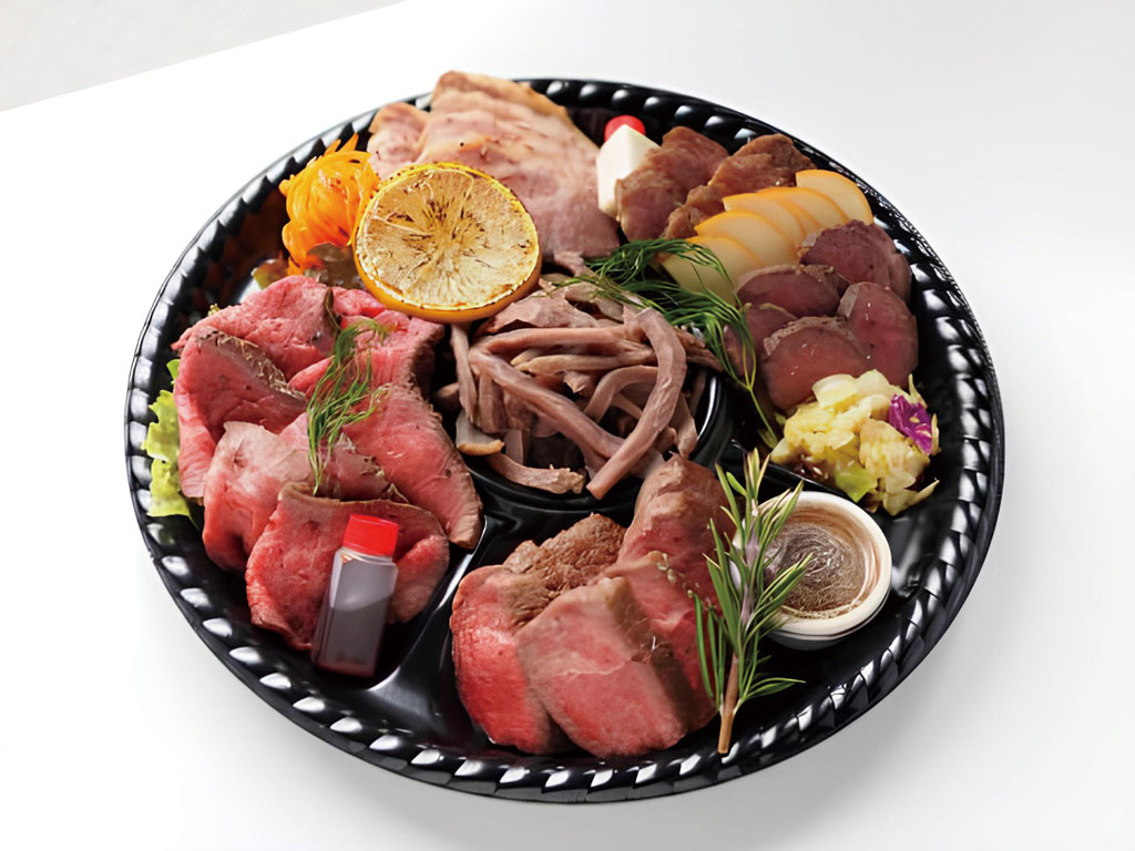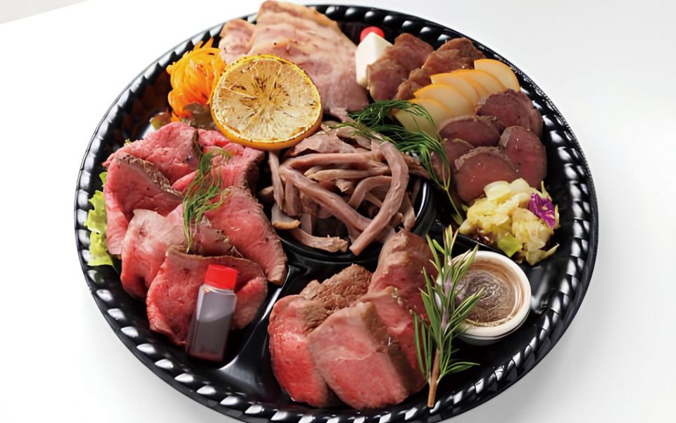 西予市の自社牧場で育てた“はなが牛”を中心に弁当やオードブルを提供。3,000円~10,000円のオードブルには、自慢の肉加工品が満載。早めの予約を。
